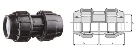 Диаметры компрессионной муфты – 110мм, 90мм, 75мм, 63мм, 50мм, 40мм, 32мм, 25мм, 20мм. Верхний порог температуры – 45 градусов по Цельсию. Давление при малых диаметрах – 15 Бар, а при больших (от 75мм) – 10 Бар.